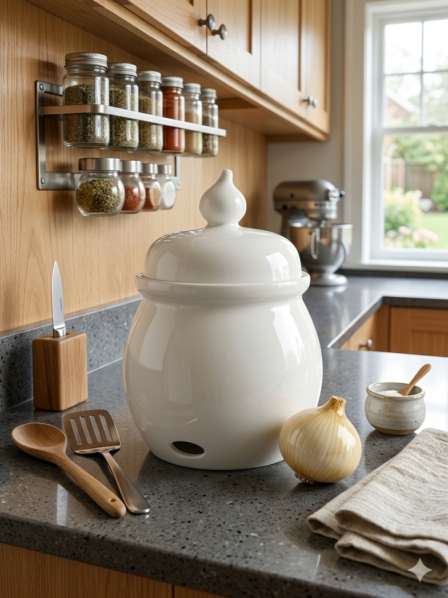 Pastreaza ceapa proaspata pentru mai mult timp cu acest recipient special conceput pentru depozitare. Datorita dimensiunilor generoase (25 cm inaltime si 16 cm diametru), ofera suficient spatiu pentru stocarea unei cantitati optime de ceapa, fara a ocupa mult loc in bucatarie.