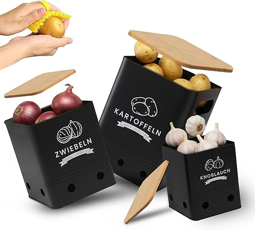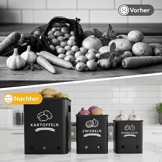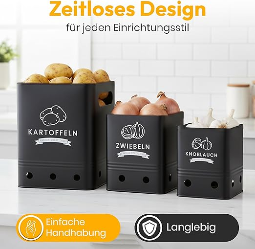 Fiecare cutie este special destinata unui tip de leguma, facilitand organizarea si accesul rapid. Sunt ideale pentru blat, camara sau rafturi de bucatarie.