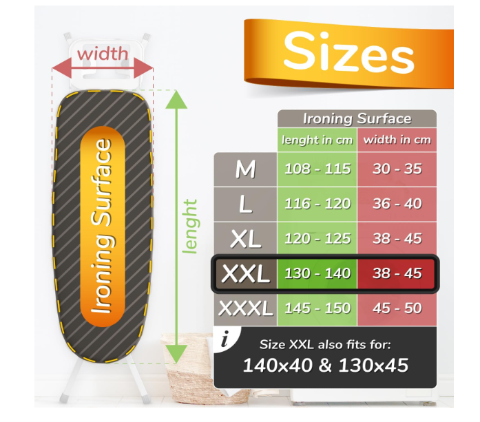- Compatibilă cu mese de călcat cu dimensiuni între 110 x 30 cm și 130 x 48 cm (sau alte dimensiuni indicate pe ambalaj).