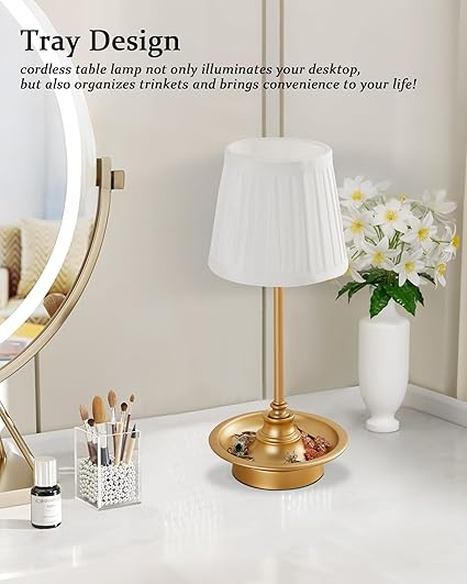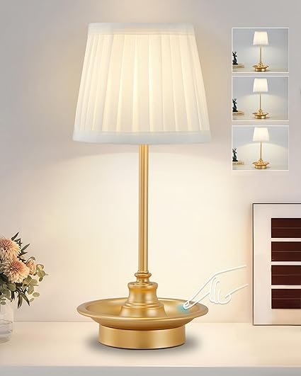 Lampa de masa LED reincarcabila, fara fir, cu control touch si intensitate reglabila. Design elegant cu abajur textil, ideala pentru dormitor, birou sau restaurant.