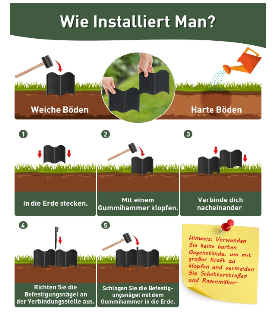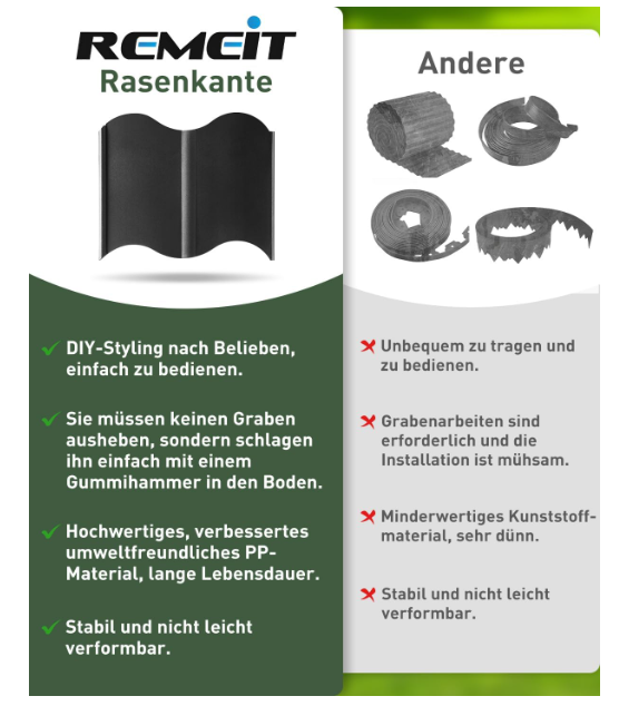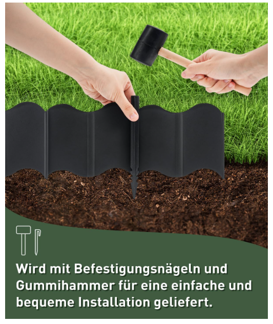 Acest set de borduri este potrivit pentru utilizarea in gradini private, parcuri, spatii verzi, zone rezidentiale sau comerciale. Materialul este sigur, non-toxic si suporta temperaturi ridicate sau scazute, pastrandu-si forma si flexibilitatea.