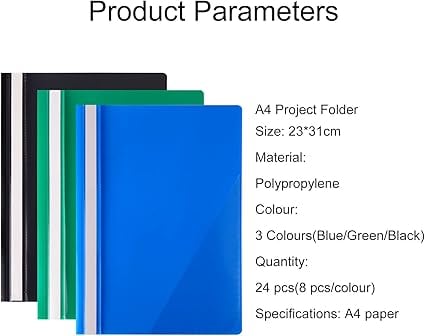 Setul de 24 dosare pentru proiecte A4 Hotyin este ideal pentru organizarea si prezentarea documentelor la birou, acasa sau la scoala. Fiecare dosar este realizat din plastic rezistent, cu o coperta frontala transparenta care permite vizualizarea usoara a primei pagini, oferind un aspect profesional si curat.