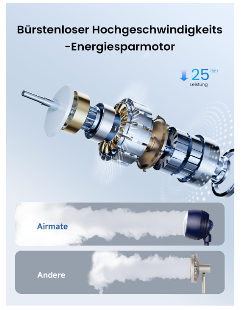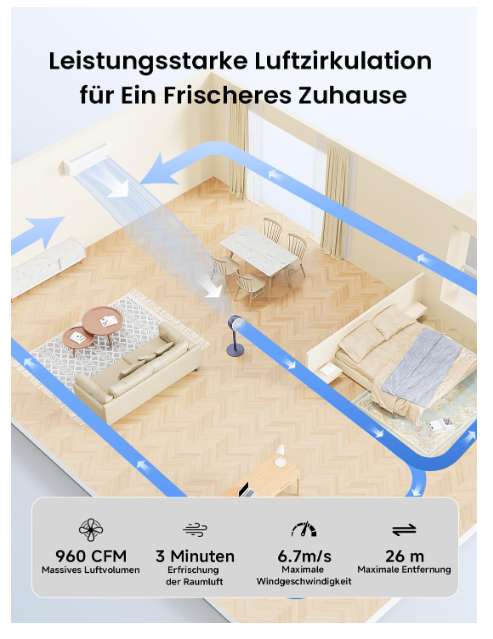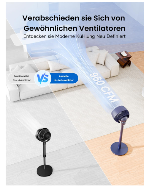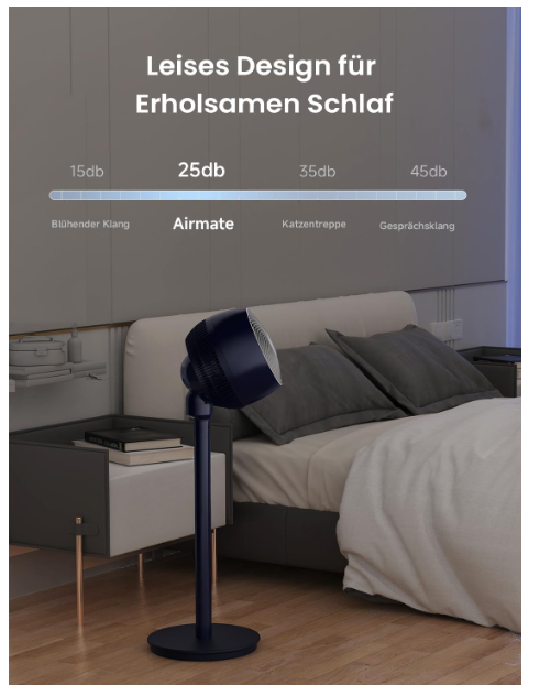 Ventilatorul cu picior AIRMATE Turbo este proiectat pentru racire eficienta si confort zilnic. Ofera un flux de aer puternic, dar silentios, cu nivel de zgomot redus de aproximativ 25 dB, fiind potrivit inclusiv pentru dormitor sau birou.