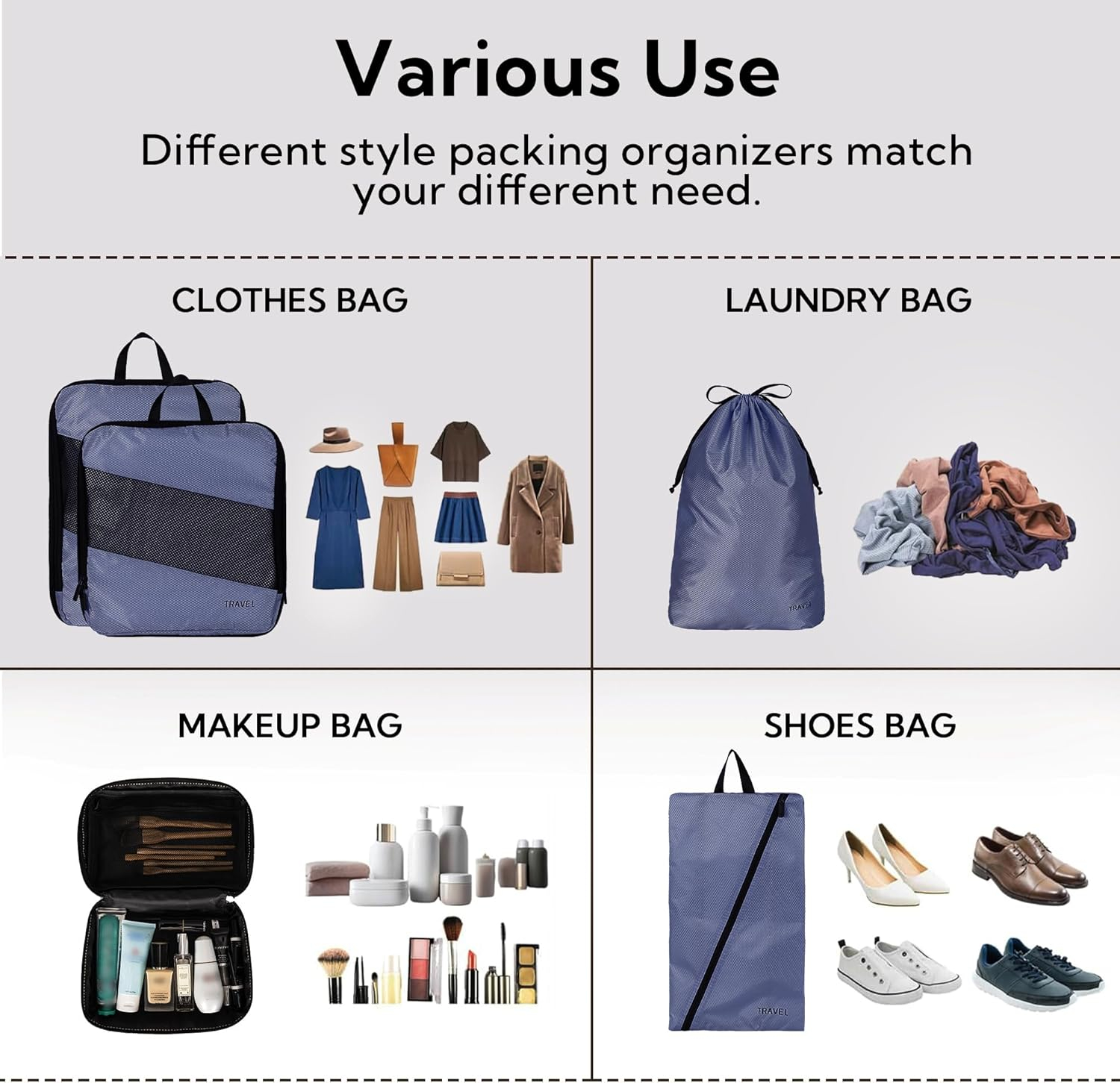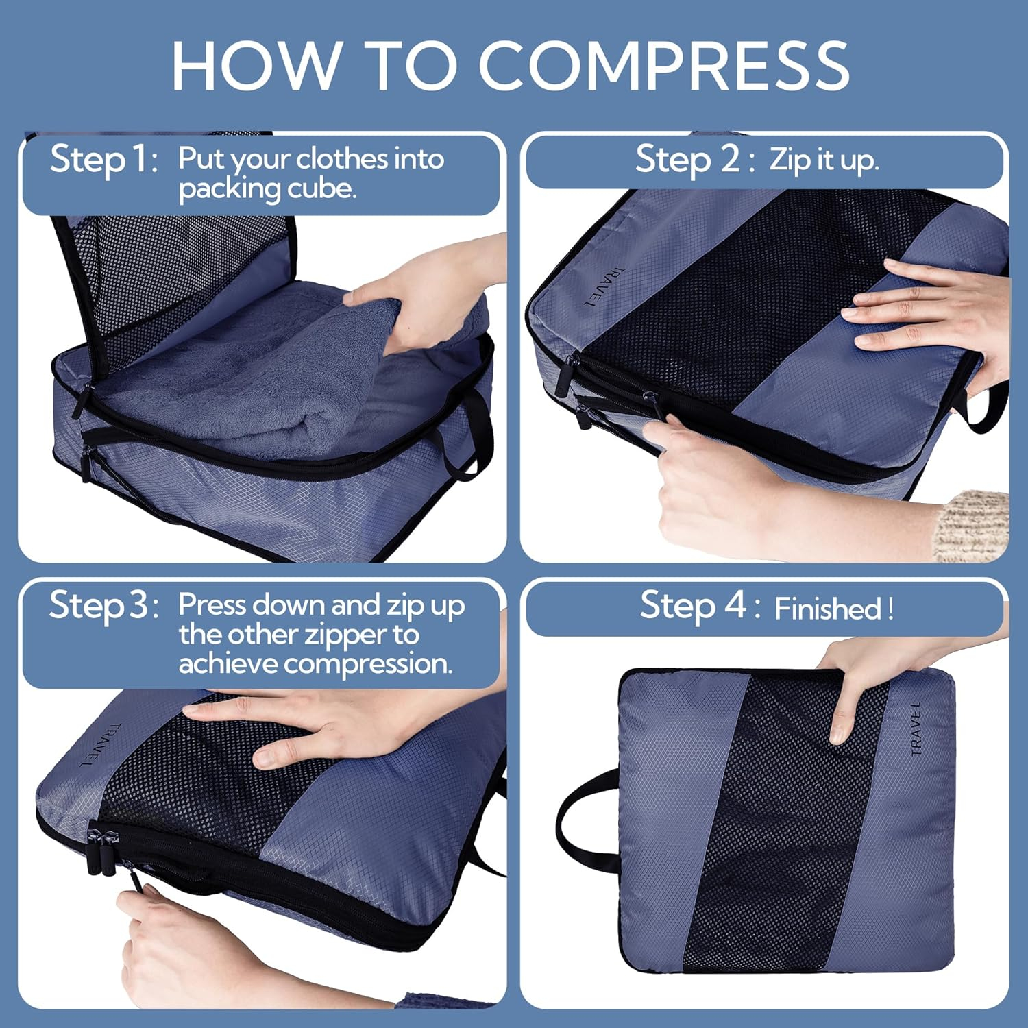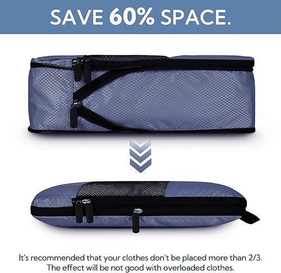 Datorita fermoarelor duble de compresie, hainele pot fi presate eficient pentru a reduce volumul, pastrand in acelasi timp ordinea in bagaj. Setul include diferite dimensiuni, potrivite pentru tricouri, pantaloni, lenjerie, incaltaminte si alte articole vestimentare.