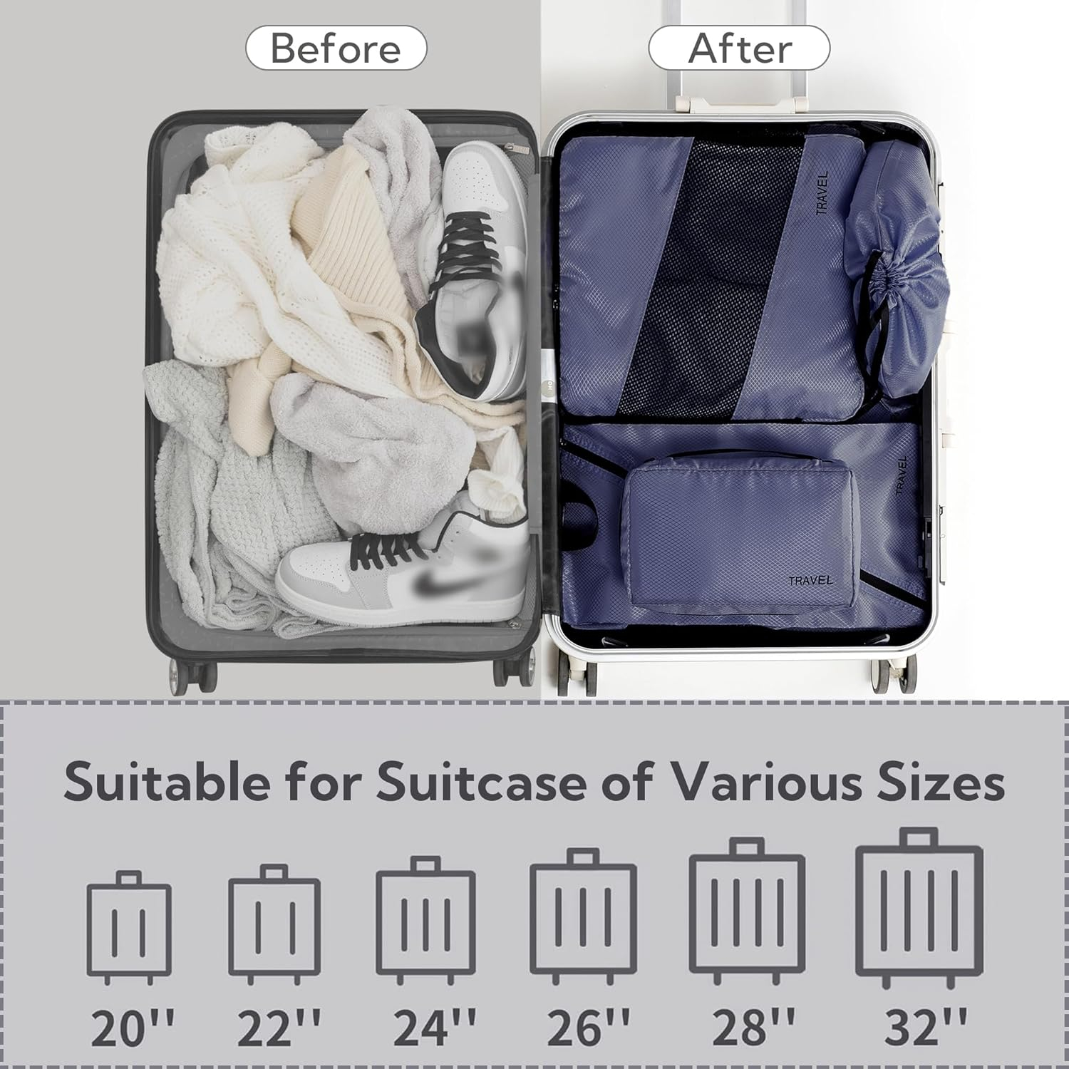 Setul de 6 organizatoare haine pentru calatorie cu functie de compresie de la GRANNY SAYS este accesoriul esential pentru orice calatorie. Aceste organizatoare de haine sunt fabricate din materiale usoare si rezistente, concepute pentru a economisi spatiu in bagajul de mana sau in troler.