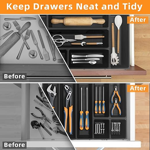Organizatorul pentru tacamuri permite o organizare eficientă a ustensilelor de bucătărie, articolelor de papetărie sau accesoriilor mici. Este extensibil și reglabil astfel încât să se potrivească în diverse sertare. Dispune de 7 compartimente, ideale pentru tacâmuri, ustensile culinare, obiecte mici sau bijuterii. Fabricat din plastic durabil (de ex. PP, BPA-free), este ușor de curățat și rezistent la uzură. Design-ul adaptabil optimizează spațiul din sertare aglomerate și contribuie la eficiența organizării zilnice