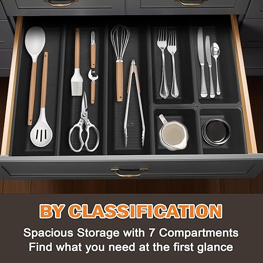 Organizator reglabil cu 7 compartimente, extensibil, din plastic rezistent – perfect pentru tacâmuri, ustensile sau organizare interior de sertar.