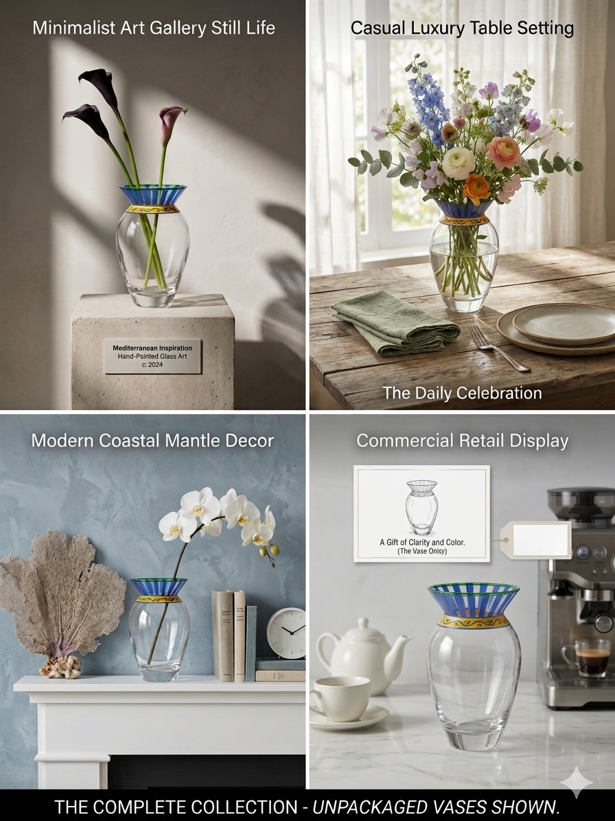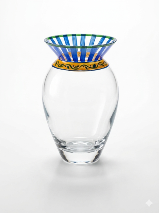 Vaza de 21 cm, pictata manual, realizata din sticla transparenta de calitete, este alegerea ideala pentru aranjamente elegante.